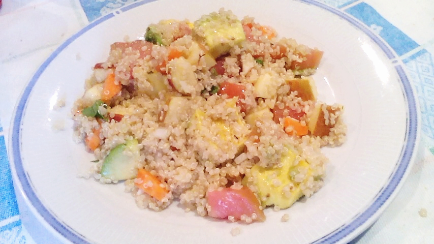 Comece por cozinhar a quinoa (previamente lavada) num pequeno tacho juntamente com a água. Quando começar a ferver, coloque o lume no mínimo e deixe cozinhar até a água desaparecer. Após, ponha de lado para arrefecer (aconselho a fazer isto cerca de 1h-45min antes de servir, de maneira a que a quinoa fique fria ou quase fria).